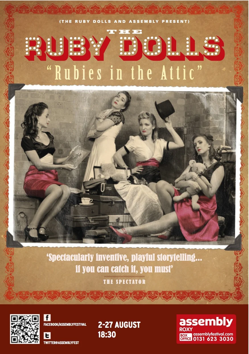 Premiering in 2011 at the Jermyn Street Theatre in Piccadilly Circus, Rubies In The Attic explored how the past has shaped us all, through the true family histories of the four Dolls. Intertwining Coward with Klezmer and Tango with African folk, The Dolls crossed musical landscapes and political divides to unearth their beginnings and sing their way home. The production mixed live music with text, physical theatre and Bunraku puppetry. Following further performances at Riverside Studios in Hammersmith, The Dolls, co-produced by Assembly, made their Edinburgh festival debut with this show to critical acclaim in 2012.